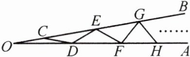 11. 新情境 生产生活 如图,一建筑钢架$\angle AOB = 10^{\circ}$,为使钢架更加稳固,需在内部添加一些钢管$CD$,$DE$,$EF$,$FG$,$GH$,…$$,若添加的钢管都与$OC$等长,则最多能添加这样的钢管