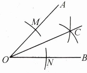 ②分别以点M,N为圆心,大于$\frac{1}{2}MN$的长为半径作弧,两弧在∠AOB的内部相交于点C。