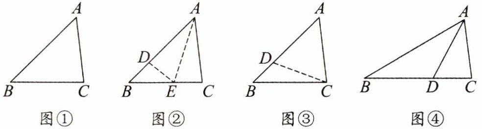 思路一:如图②,小涛认为:作$∠BAC的平分线AE$.$\because AB>AC$,$\therefore在AB上截取AD= AC$,连结$DE$,利用全等以及三角形的一个外角大于任何一个和它不相邻的内角即可证明.