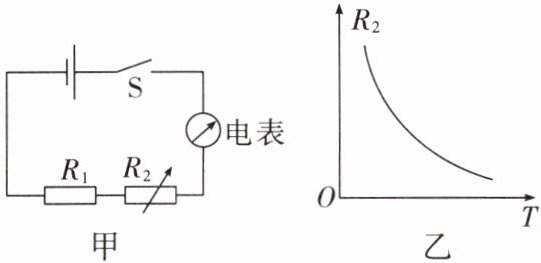 9. (2025 成都金牛区期末)小明有一个可以显示水温的“智能水杯”。为了研究“智能水杯”内部的电路,小明设计了如图甲所示的电路来模拟“智能水杯”的功能。其中 $R_{1}$ 为定值电阻,热敏电阻 $R_{2}$ 的阻值随温度的变化关系如图乙所示,电源电压不变,图甲中电表的示数可以反映温度的高低。当热敏电阻的温度升高时(