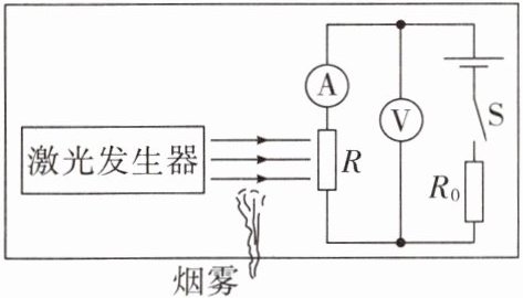 12. 如图所示是列车上烟雾报警器的简化原理图。内装有一个激光发生器及带有一个光敏电阻 $R$ 的电路,其中电源电压恒定,$R_{0}$ 为定值电阻。有烟雾产生时,激光被烟雾遮挡而使光敏电阻的阻值发生变化,从而改变电路中的电流。当电路中的电流增大至某一数值时报警器开始报警。下列说法正确的是(