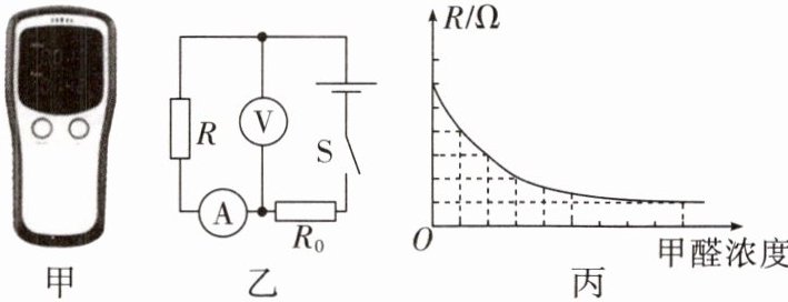 11. (2025 成都武侯区期末)如图甲所示的家用甲醛检测仪具有多项数据检测性能。如图乙所示,小江画出了这个仪器的模拟电路图,电源电压恒定不变,$R_{0}$ 为定值电阻,$R$ 为气敏电阻,其阻值随甲醛浓度变化的曲线如图丙所示。下列说法正确的是(