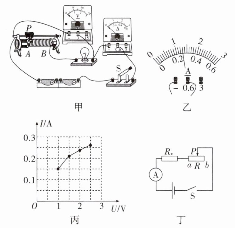 。(3)排除故障后进行实验,当电压表示数为 2.6 V 时,电流表示数如图乙所示,则通过 $ R_x $ 的电流为