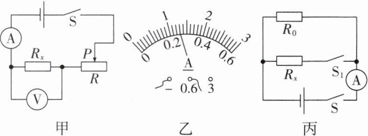 。(5)小华对实验进一步拓展,利用电源(电压未知但恒定不变)、阻值为 $ R_0 $ 的定值电阻、电流表、开关等器材,设计了如图丙所示的电路,也能测出 $ R_x $ 的阻值,请完成下列实验步骤: