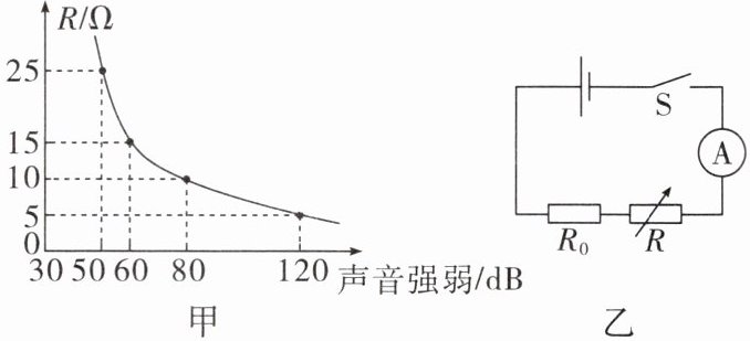 4. (2024 遂宁)噪声污染是当代社会四大污染之一,若青少年长期处于噪声环境中会影响身心健康。为了监测噪声的强弱,同学们找来定值电阻 $ R_0 $、声敏电阻 $ R $(阻值会随声音强弱发生变化)、电流表、学生电源等器材,设计了可用电流表的示数来反映噪声强弱的装置,其中 $ R $ 的阻值随声音强弱变化的关系如甲图所示,该装置电路如乙图所示。在某次测试中,当噪声 80 dB 时,电流表示数为 0.4 A;当噪声 50 dB 时,电流表示数为 0.2 A。下列选项正确的是(