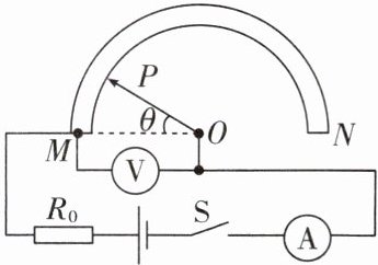 6. (2025 成都金牛区期末)新房装修时,工人经常用普通量角器测量一些角度,但读数不方便。小鹏根据所学的知识设计了一款电子量角器,电路如图所示,$ O $ 为半圆弧电阻 $ MN $ 的圆心,金属滑片 $ OP $ 为半径,与半圆弧接触良好,接入电路的电阻 $ R_P $ 与指针旋转角度 $ \theta $ 成正比,电源电压恒定,$ R_0 $ 为 30 Ω 定值电阻。将滑片 $ OP $ 旋转至 $ M $ 处,电流表读数为 0.2 A;将滑片 $ OP $ 旋转至 $ N $ 处,电流表读数为 0.1 A。