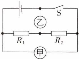 5. (2024 凉山)如图所示的电路中 $ R_1 : R_2 = 1 : 2 $,当开关 $ S $ 闭合,甲、乙两表均为电压表时,两电压表示数之比为