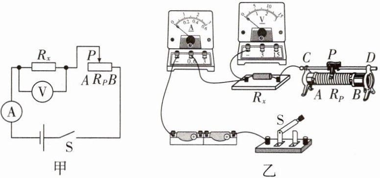 例3 (2024 遂宁)老师带领芳芳所在的班到实验室进行分组实验,利用两节干电池、电流表、电压表、滑动变阻器(最大阻值为 $ R_P $)等器材测量未知电阻 $ R_x $ 的阻值,实验所用的电路如甲图。