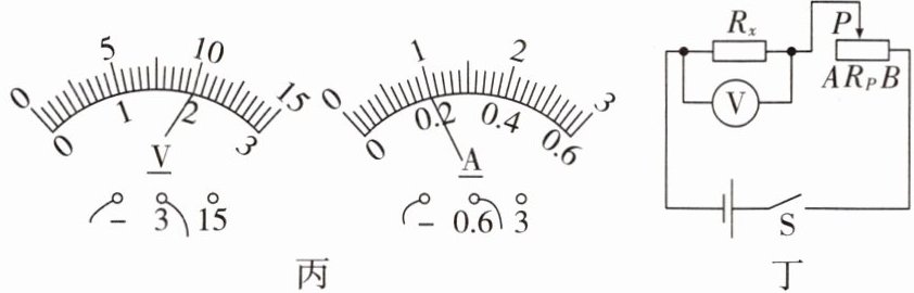 (3) 排除故障后,闭合开关 $ S $,调节滑片 $ P $,直到电压表、电流表示数如丙图所示,则 $ R_x $ 的阻值为____Ω。