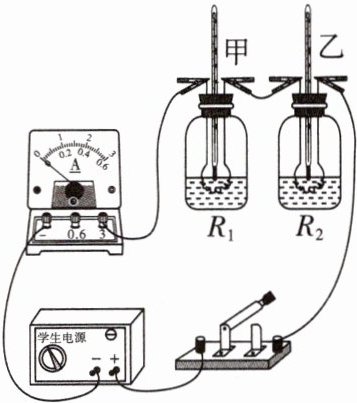 典例2 (2024辽宁)如图,甲、乙两个透明容器内均装有质量为100g、初温为25℃的某种绝缘液体,甲、乙中都有一段电阻丝$,R_1= 5Ω,R_2= 10Ω。$闭合开关,电流表的示数为1.2A。通电120s后,甲中温度计的示数为29℃,求: