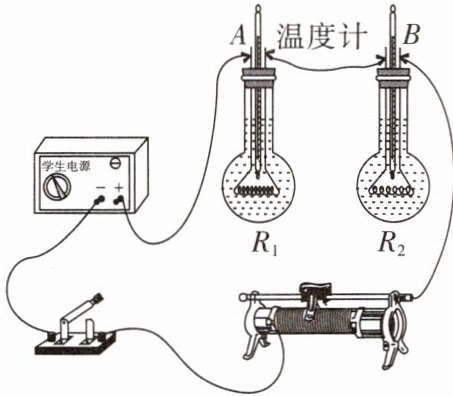 变式1 小京用如图所示的电路探究电流通过导体产生的热量与导体的电阻是否有关,其中两个烧瓶完全相同,瓶内装有质量和初温相同的煤油、相同的温度计A和B、阻值不等的电阻丝$R_1$和$R_2。$