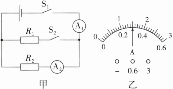 2. (2024 遂宁)在甲图所示的电路中,闭合开关 $S_{1}$,再闭合开关 $S_{2}$,电流表 $A_{1}$ 的示数变大,此时两电流表指针都指在刻度盘的中央,均如乙图所示,则通过 $R_{1}$ 的电流为 $\underline{