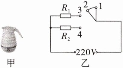 4. (2024 南充)如图甲所示为某品牌电热水壶。该型号电热水壶内部简化电路如图乙,额定电压为 $ 220 \, V $,具有加热、保温两挡。保温挡的额定功率为 $ 100 \, W $,双触点开关只能在触点 $ 1 $ 和 $ 2 $、$ 2 $ 和 $ 3 $ 及 $ 3 $ 和 $ 4 $ 之间切换。$ R_{1} $、$ R_{2} $ 是两个阻值不变的发热元件,其中 $ R_{2} = 60.5 \, \Omega $。现将此电热水壶装入 $ 0.45 \, L $ 初温为 $ 20 \, {\hspace{0pt}}^{\circ }\mathrm{C} $ 的水,接到 $ 220 \, V $ 的家庭电路中,选用加热挡加热至 $ 100 \, {\hspace{0pt}}^{\circ }\mathrm{C} $,已知该电热水壶加热效率为 $ 80\% $,$ \rho_{水} = 1.0 × 10^{3} \, kg/m^{3} $,$ c_{水} = 4.2 × 10^{3} \, J/(kg \cdot {\hspace{0pt}}^{\circ }\mathrm{C)} $。求: