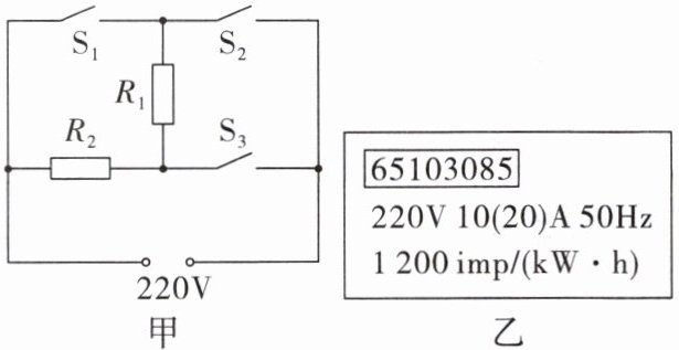 6. 小明家的电饭锅,额定电压 $220V$,简化电路如图甲所示。发热电阻 $R_{1}$、$R_{2}$ 阻值不随温度变化,操作开关 $S_{1}$、$S_{2}$、$S_{3}$ 的通断($S_{1}$、$S_{2}$ 不会同时闭合),可实现煮饭、煲汤、保温三个挡位调节,只闭合 $S_{3}$ 时,为煲汤挡,额定功率为 $440W$。求:
