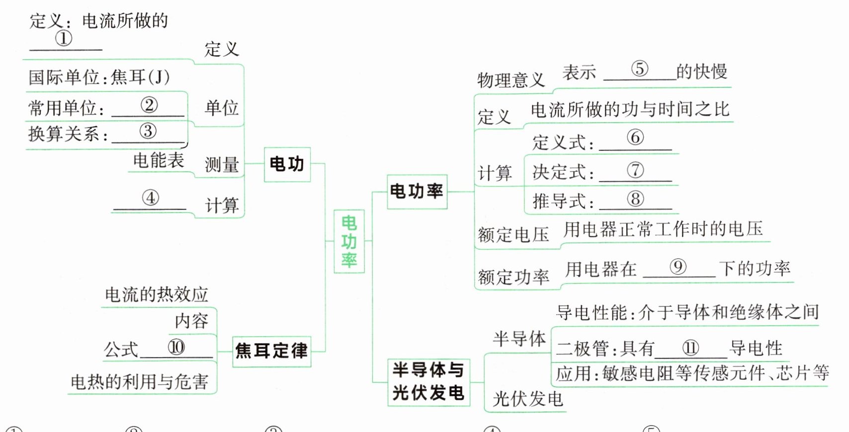 ①功 ②kW·h ③1 kW·h=3.6×10⁶ J ④W=UIt ⑤电流做功 ⑥$P=\frac{W}{t}$ ⑦P=UI ⑧$P=I^{2}R$、$P=\frac{U^{2}}{R}$ ⑨额定电压 ⑩$Q=I^{2}Rt$ ⑪单向