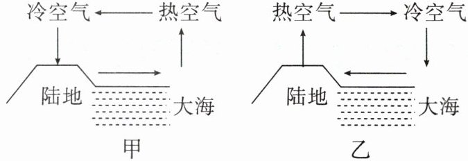 乙 陆地上沙石的比热容比海水的比热容小