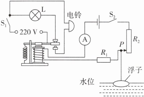 12. (多选)为了应对即将到来的汛期,某课外兴趣小组设计了一个检测水库水位的装置,其原理如图所示。L为安全指示灯,电铃为报警器$,R_1$为定值电阻$,R_2$为竖直放置、粗细均匀且足够长的电阻棒,滑片P可以在电阻棒上自由滑动,并与浮子用竖直的绝缘杆连接,可随着浮子的上下移动而改变电阻棒$R_2$接入电路的阻值,从而可通过电流表的示数来反映水位的高低。当滑片P指向$R_2$的中点时,水位达到警戒值,电磁铁吸下衔铁报警。则该检测器正常工作时(