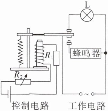13. (多选)(2024河南)如图是小明为某仓库设计的温度报警电路。$R_1$为热敏电阻,其阻值随温度的变化而变化;$R_2$为可调电阻。温度正常时指示灯L发光,当温度升高到报警温度时,指示灯熄灭,蜂鸣器报警。下列判断正确的是(
