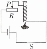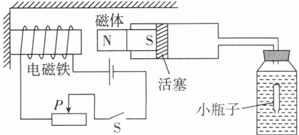 11. 新考法 创新设计 在科技晚会上,小明给大家展示了一个“听话”的小瓶子,通过调节滑片,就可以让小瓶子上浮、下沉或悬停在水中,它的原理如图所示(磁体固定在活塞上),闭合开关S后,移动滑片P,使小瓶子悬停在图示位置。下列分析正确的是(