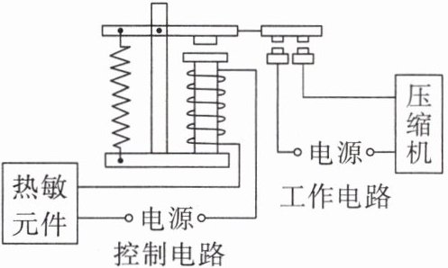 可以看作工作电路中的开关。夏天,压缩机工作,空调制冷,当房间温度降低,热敏元件的电阻随温度降低而增大,控制电路的电流减小