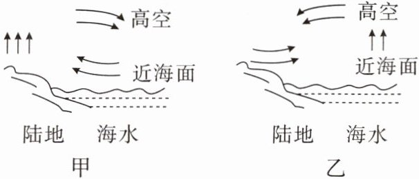 (选填“快”或“慢”),表现出海洋和陆地的性质差异,从而影响气候。(2)晴朗夏日,海边城市陆地与海洋之间会形成海、陆风,可用甲、乙两图表示,其中表示晚间空气流动的是
