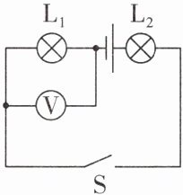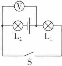 3. 如图所示,电源电压为3V,电压表示数为2V,则灯泡$L_2$两端的电压为(