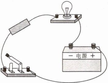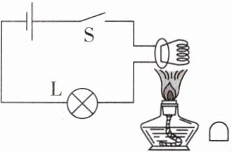 7. 刘老师在课堂上做了一个演示实验,实验器材有玻璃泡破碎但钨丝完好的废白炽灯、小灯泡 L、蓄电池、开关 S、酒精灯、火柴、导线若干。连接的电路如图所示,当闭合开关 S 时,小灯泡 L 正常发光,然后用点燃的酒精灯对废白炽灯的钨丝加热,可观察到小灯泡 L 的亮度明显变暗,此时通过小灯泡 L 的电流变