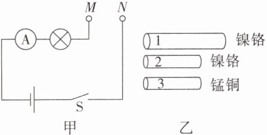 5. (2024 成都期中)同学们利用如图甲所示的电路探究“影响电阻大小的因素”,其中 1、2、3 电阻丝材料如图乙所示,2、3 电阻丝长度相同、粗细相同,1 长度最长、横截面积最大。下列说法中正确的是(