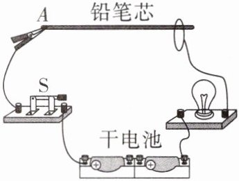 6. 小佑收集了很多材料和长度都相同但粗细不同的铅笔芯。如图所示,是他用身边的器材自制的简易调光灯电路。闭合开关,夹子 A 向右移动的过程中灯泡亮度应该
