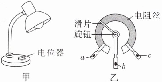 4. (2025成都期末)如图甲是可调亮度的台灯,图乙是该台灯电位器的结构图,$a$、$b$、$c$是电位器的三个接线柱,$a$、$c$分别与弧形电阻丝的两端相连,$b$与金属滑片相连,转动旋钮,可调节灯泡的亮度。下列分析正确的是(