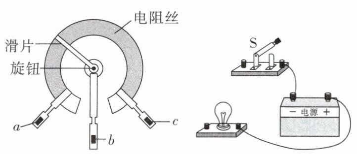 所以需要将滑动变阻器的$b$、$c$接线柱接入电路(这样顺时针旋转旋钮时,接入电路的电阻丝变短,电阻变小,电流变大,灯泡变亮)。