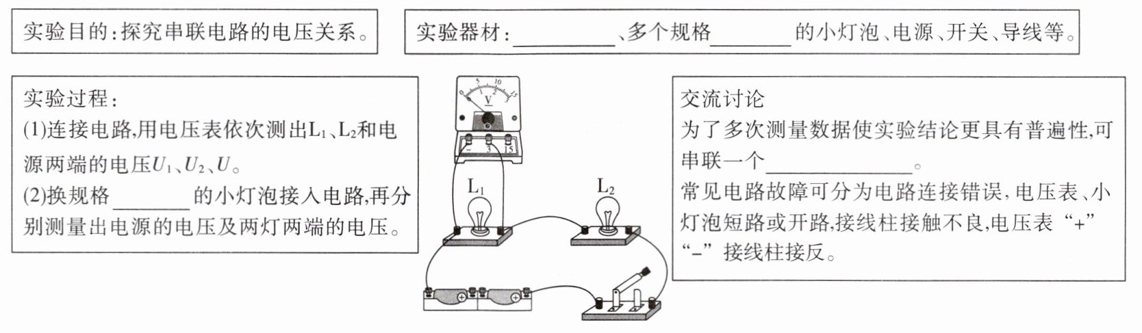 实验目的是探究串联电路的电压关系,需要测量电压,所以实验器材中有$\boldsymbol{电压表}$;为了使实验结论具有普遍性,要选用多个规格$\boldsymbol{不同}$的小灯泡进行实验。