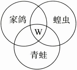 11. 右图中的圆圈表示家鸽、青蛙和蝗虫三种生物各自的特征。若重合部分 W 表示它们的共同特征,则 W 是(