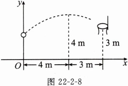 15. 某校九年级的一场篮球比赛中,队员甲正在投篮,已知球出手时离地面高 $ \frac{20}{9} $ m,当球出手后水平距离为 $ 4 $ m 时到达最大高度 $ 4 $ m,设篮球运行的轨迹为抛物线,建立如图 22-2-8 所示的平面直角坐标系。