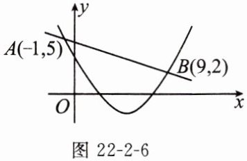 12. 如图 22-2-6 所示,一次函数 $ y_{1} = kx + n $ 与二次函数 $ y_{2} = ax^{2} + bx + c $ 的图象相交于 $ A(-1, 5) $,$ B(9, 2) $ 两点,则关于 $ x $ 的不等式 $ kx + n \geq ax^{2} + bx + c $ 的解集为(