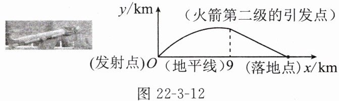某科技小组运用信息技术模拟火箭运行过程. 如图22-3-12,以发射点为原点,地平线为x轴,垂直于地面的直线为y轴,建立平面直角坐标系,分别得到抛物线$y = ax^{2}+x和直线y = -\frac{1}{2}x + b$. 其中,当火箭运行的水平距离为9km时,自动引发火箭的第二级.