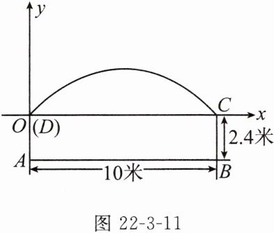 7. 已知一条双向公路隧道,其横断面由抛物线和矩形ABCD的三边组成,隧道的最大高度为4.9米,$AB = 10$米,$BC = 2.4$米,现把隧道横断面放在如图22-3-11所示的平面直角坐标系中,有一辆高为4米,宽为2米的装有集装箱的汽车要通过该隧道,如果不考虑其他因素,汽车的右侧至少离开隧道石壁多少米才不至于碰到隧道顶部?