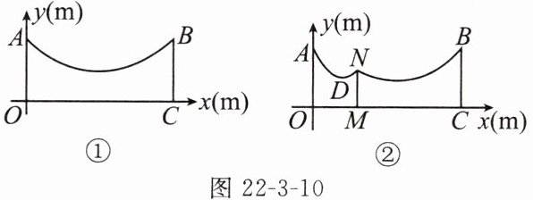 6. 如图22-3-10①,AO,BC是两根垂直于地面的立柱,且长度相等. 在两根立柱之间悬挂着一根绳子,建立坐标系,绳子形如抛物线$y= \frac{1}{10}x^{2}-x + 4$. 因实际需要,在OA与BC间用一根高为2.5m的立柱MN将绳子撑起(如图②),若立柱MN到OA的水平距离为3m,MN左侧抛物线的最低点D与MN的水平距离为1m,则点D到地面的距离为