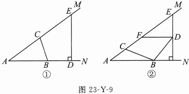 (1)如图23-Y-9①,当点 $ D $ 在射线 $ AN $ 上时,求证: $ C $ 是 $ AE $ 的中点;