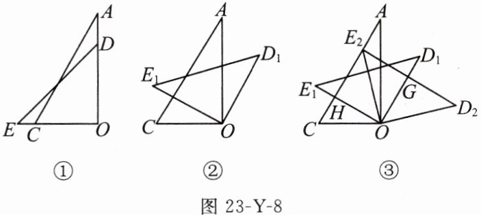 9. (2023德阳)将一副三角尺 $ DOE $ 与 $ AOC $ 叠放在一起,如图23-Y-8①, $ \angle O = 90^{\circ} $, $ \angle A = 30^{\circ} $, $ \angle E = 45^{\circ} $, $ OD > OC $.将三角尺 $ DOE $ 绕点 $ O $ 顺时针旋转 $ \alpha(0^{\circ} < \alpha < 90^{\circ}) $ 到 $ \triangle D_1OE_1 $ 的位置,使 $ OD_1 // AC $,如图②.