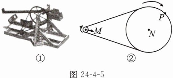 7. (2024 兰州) “轮动发石车”是我国古代的一种投石工具,在春秋战国时期被广泛应用,图 24 - 4 - 5①是陈列在展览馆的仿真模型,图②是模型驱动部分的示意图,其中$ \odot M ,$$ \odot N 的半径分别是 1 \mathrm { cm } 和 10 \mathrm { cm } ,当 \odot M $顺时针转动 3 周时,$ \odot N $上的点 P 随之旋转$ n ^ { \circ } ,$则 n =
