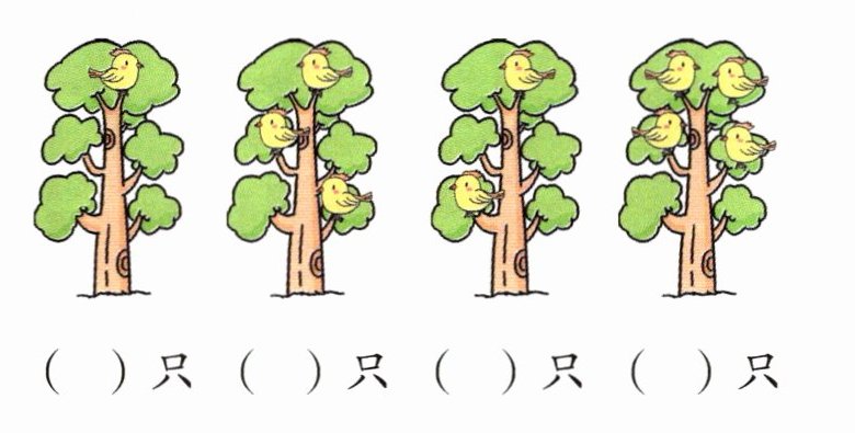 3. 每棵树上原来都有7只小鸟,飞走一些后,剩下的如图。每棵树上飞走了几只小鸟?
