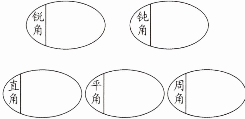 ∠A:锐角 ∠B:直角 ∠C:钝角 ∠D:平角 ∠E:周角