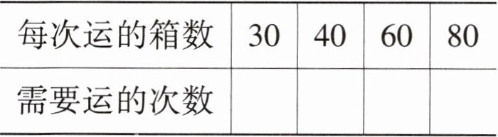 6. 新轮公司要运480箱货物。如果每次运30箱,需要运多少次?如果每次运的箱数分别是40箱、60箱和80箱呢?将下面的表格填写完整。