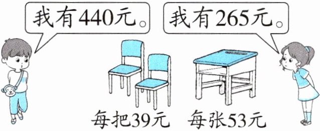 440+265=705(元) 39+53=92(元) 705÷92=7(套)……61(元) 最多能买7套桌椅