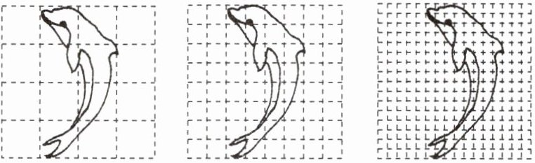 6.第一个题图每个小方格的面积为32×32÷(4×4)=64(平方厘米) 第二个题图每个小方格的面积为32×32÷(8×8)=16(平方厘米) 第三个题图每个小方格的面积为32×32÷(16×16)=4(平方厘米) 估计海豚面积合理即可