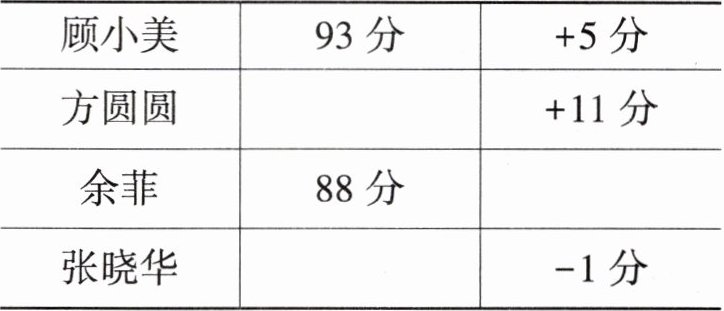 4. 一次单元测验的平均成绩为88分,顾小美得了93分,记作“+5分”,如果余菲得了88分,你能用正负数表示她的成绩吗?方圆圆的得分记作“+11分”,张晓华的得分记作“-1分”,他们实际考了多少分?将结果填入下表中。