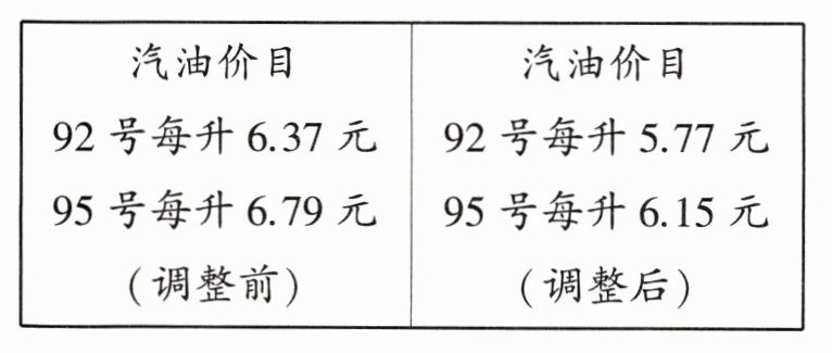 6. 某日,我国对汽油价格进行调整(如图)。如果一辆出租车每天要消耗$92号汽油约60$升,那么调整后比调整前每天要节约多少元汽油费?