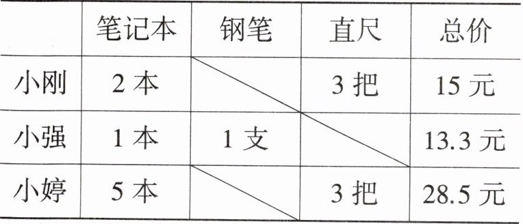 提示:从题表中可知,小婷比小刚多买了(5−2)本笔记本,多用了(28.5−15)元,由此可求出笔记本的单价。通过题表中的数量关系进而求出钢笔和直尺的单价。