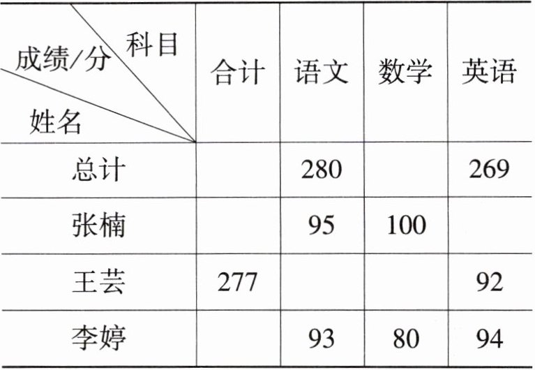 )的三门学科总分最高。(3)她们三人数学成绩的平均分是(